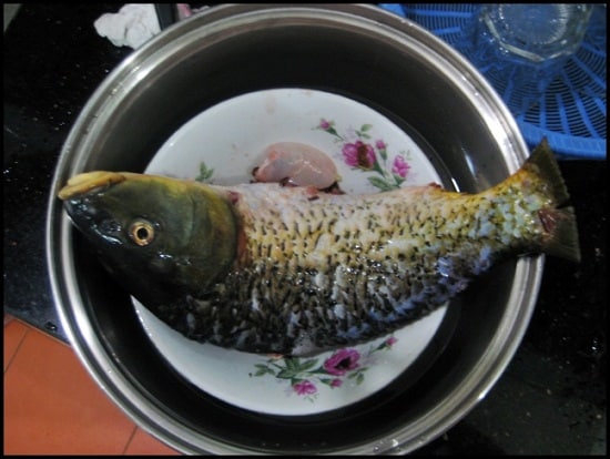 - Cá chép đánh vẩy, moi mang, mổ bụng bỏ nội tạng, cắt bỏ đầu cá, rửa lại thật sạch bằng nước muối hạt hoặc nước cốt chanh rồi rạch ngang thân cá 3-4 đường để cá nhanh chín và ngấm gia vị.