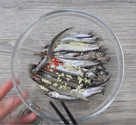 – Khi cá ráo nước tiến hành ướp cá với muối, hạt nêm, hành tỏi, ớt băm nhỏ rồi trộn đều thật nhẹ nhàng để cá thấm gia vị mà không bị nát hay gãy.