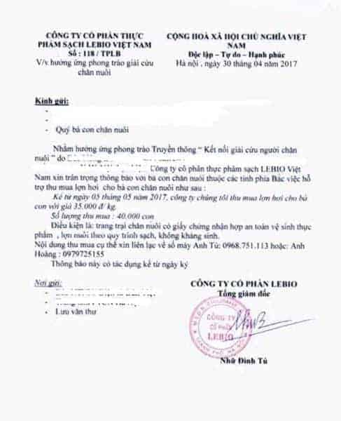 Một người chăn nuôi tên Thế Anh ở huyện Ứng Hòa, vì quá bức xúc đã lên mạng tố cáo đích danh Công ty CP Lebio thông báo mua giải cứu 40.000 con lợn giá 35.000 đồng/kg thực tế chỉ là hành động “nổ cho sướng mồm”. Anh Thế Anh cho biết, trong 2 ngày liền có điện cho 1 người tên Hoàng và 1 người tên Tú (ông Nhữ Đình Tú, Tổng Giám đốc Công ty CP Lebio) để xem thông tin mua bán lợn kiểu gì.