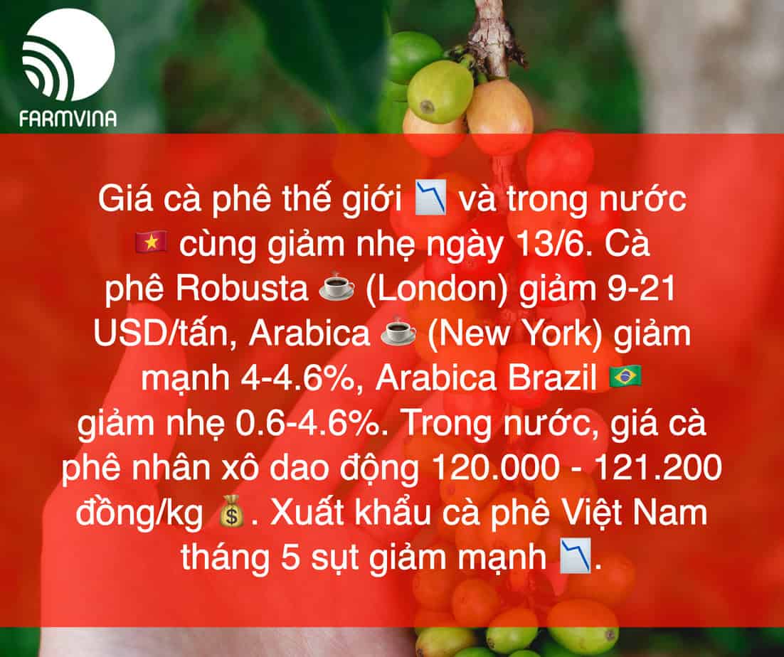 Giá cà phê Arabica trên sàn New York sáng ngày 13/6/2024 giảm mạnh, với mức giảm từ 215.30 – 215.95 cent/lb. Chi tiết: