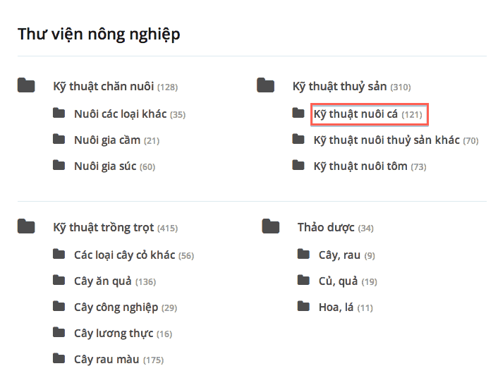Ví dụ bạn muốn tìm Kỹ thuật nuôi cá kèo, bạn đơn giản chọn mục Kỹ thuật nuôi cá trong thư mục Kỹ thuật thuỷ sản, sau đó vào mục K (Cá Kèo) để tìm tất cả các bài viết liên quan cho đến khi bạn có được thông tin mong muốn.