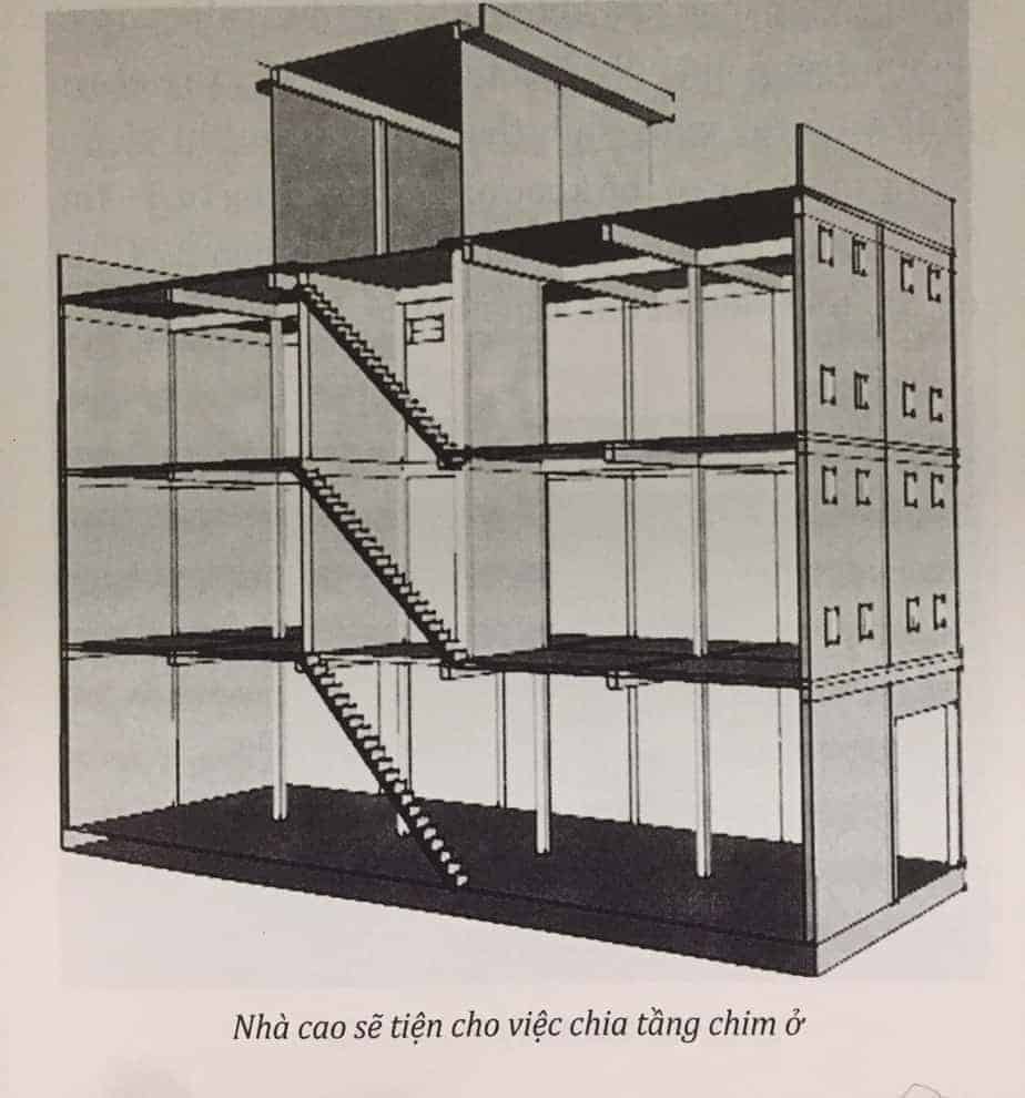 Độ cao mỗi tầng nhà chim ít nhất 2m, thí dụ căn nhà có độ cao 7,5m thì chia làm 3 tầng, mỗi tầng lại chia thành các phòng. Tuy nhiên cần chú ý là có khoảng thông tầng. Làm sao cho bầu không khí trong phòng giống như trong các hang vách đá tự nhiên.