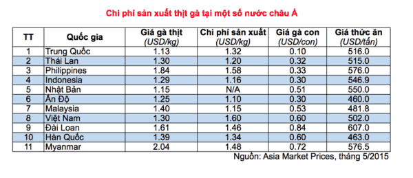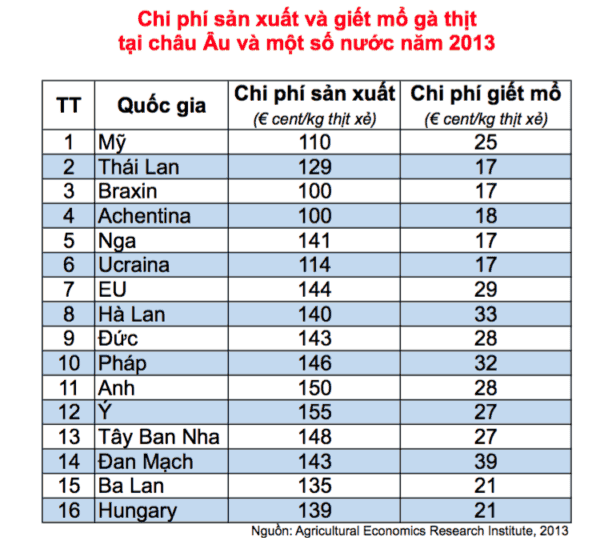 Vị này cũng dẫn chứng, từ năm 2013 thịt gà Mỹ nhập về tới Việt Nam 27.000 – 28.000 đồng một kg, 6 tháng đầu năm nay giảm xuống còn 17.000 – 20.000 đồng một kg. Theo tính toán của một số chủ trang trại, thịt gà Mỹ nhập về với giá 20.000 đồng một kg, tương đương 15.200 đồng một kg gà sống (gà hơi). Nếu trừ chi phí cấp đông, phân phối, vận chuyển, thuế thì giá gà hơi chỉ chưa tới 10.000 đồng một kg, rẻ hơn thịt gà Việt Nam 15.000 đồng, trong khi giá thức ăn cho gà Mỹ và Việt Nam chênh lệch không nhiều.